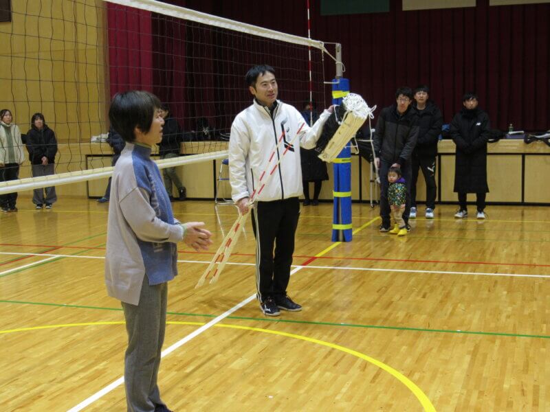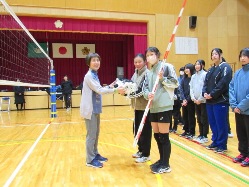 飛騨市スポーツ協会では加盟団体活動支援として、備品購入補助を実施しています。今年度は飛騨市バレーボール連盟と飛騨市スキー連盟が対象となり、バレーボール用ネットとアンテナ、スキースラローム用ポールの購入を決定しました。この事業は費用の半額を飛騨市スポーツ協会賛助会が補助しています。 バレーボール備品は1月24日(土)古川小学校で行われた飛騨神岡高校、TSUNAGU(飛騨市地域認定クラブ)、バレーボール経験者の小学6年生による合同練習にお邪魔し、堀辺会長が贈呈しました。雪の降りしきる寒い日でしたが、子ども達は元気に楽しそうに取り組んでいました。飛騨市バレーボール連盟はジュニアの育成にも熱心に取り組んでいます。次世代に繋がる活動が「スポーツで飛騨市を元気に!」になることを期待しています。 (スキー備品については後日掲載いたします)
