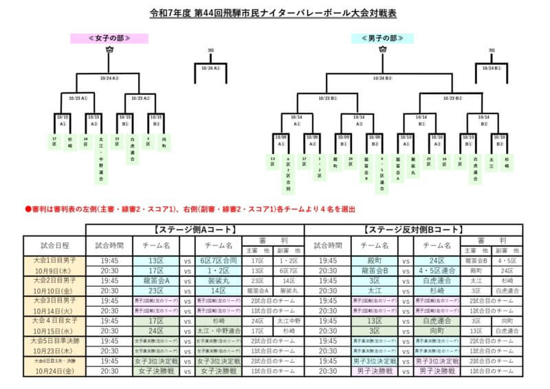 10月9日(木)より第44回飛騨市民ナイターバレーボール大会が始まります。女子の部は8チーム、男子の部は16チームの参加です。先日の抽選会で組合せが決まりました。初日10月9日(木)は13区vs6区7区、17区vs1・2区、殿町vs24区、龍笛会Bvs4・5区連合の4試合が行われます。皆さん、応援よろしくお願いいたします。結果も順次掲載していきますのでお楽しみに!