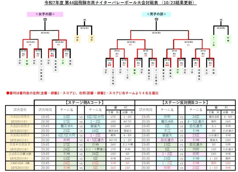 10月9日(木)より第44回飛騨市民ナイターバレーボール大会が始まりました。第1日目の試合結果をお知らせします。 13区vs6区7区合同 6区7区の不戦勝 殿町vs24区 2対0で殿町の勝利 17区vs1・2区 0対2で1・2区の勝利 龍笛会Bvs4・5区連合 1対2で4・5区連合の勝利 第2日目10月10日(金)は第1試合は龍笛会Avs袈裟丸区、3区vs白虎連合、第2試合は23区vs14区、太江区vs杉崎区の4試合が行われます。皆さん、応援よろしくお願いいたします。結果も順次掲載していきますのでお楽しみに!