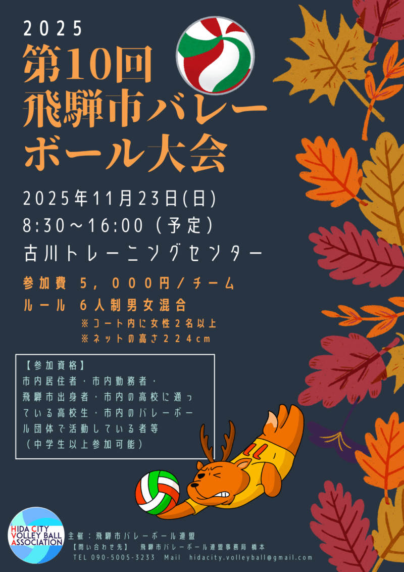 11月23日(日)第10回飛騨市バレーボール大会が開催ます。市内居住者、市内在勤者はもとより、飛騨市出身者、吉城高校及び飛騨神岡高等学校に通う高校生、市内バレーボール団体で活動している人、集まれ! 締切は11月14日(金)です。申込フォームからお申込みください。中学生も参加できます!
